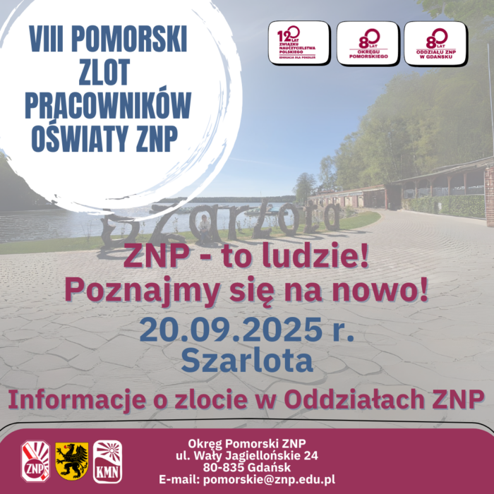 Zapraszamy na VIII Pomorski Zlot Pracowników Oświaty ZNP, który odbędzie się w 20 września 2025 r. (sobota) w Ośrodku Wypoczynkowym „ Szarlota” ( koło Kościerzyny).