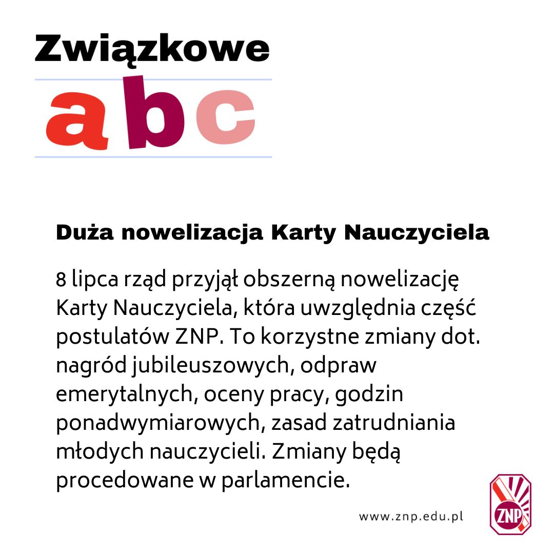 8 lipca 2025 roku rząd przyjął obszerną nowelizację Karty Nauczyciela, która uwzględnia część postulatów ZNP. To korzystne zmiany dot. nagród jubileuszowych, odpraw emerytalnych, oceny pracy, godzin ponadwymiarowych, zasad zatrudniania młodych nauczycieli. Zmiany będą teraz procedowane w parlamencie.