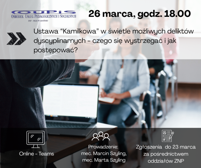 Serdecznie zapraszamy do udziału w szkoleniu on-line pt. „Zmiany w przepisach Ustawy Karty Nauczyciela dokonane w roku 2025 (wchodzące w życie w roku 2025 i 2026)” w dniu 24 listopada br. o godz. 17.30 na platformie TEAMS.